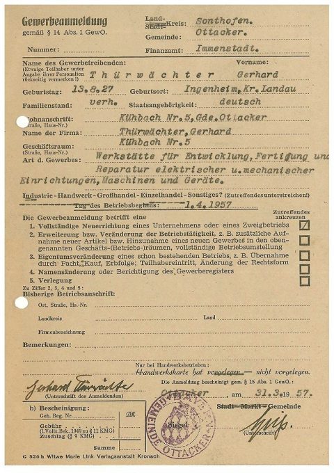 1957 Offizielle Gewerbeanmeldung als . Firma für Entwicklung, Fertigung und Stein- Sanierung elektrischer und mechanischer Einrichtungen, Maschinen und Geräte"